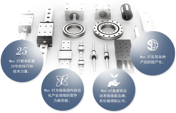 (株)Won ST以積累了25年的技巧和技術(shù)能力為基礎(chǔ),實(shí)現(xiàn)了直線運(yùn)動(dòng)單位(LM Unit)、超級(jí)直線軸承(Super Ball Bushing)、花鍵軸(Ball Spline)、直線導(dǎo)軌(Linear Motion Guide)、交叉滾柱軸承(Crossed Roller Bearing)等的韓國(guó)本土化,不僅取得替代其他歐系品牌的效果,還為確保韓國(guó)核心產(chǎn)業(yè),即半導(dǎo)體、LCD、LED及各種工作機(jī)械等自動(dòng)化產(chǎn)業(yè)領(lǐng)域的競(jìng)爭(zhēng)力做貢獻(xiàn),特別是在滾動(dòng)運(yùn)動(dòng)和滑動(dòng)運(yùn)動(dòng)的分析能力、特殊鋼及熱處理的應(yīng)用能力、超精密加工能力等領(lǐng)域中擁有核心技術(shù)。我們將繼續(xù)努力,以差異化的技術(shù)力量、嚴(yán)格的品質(zhì)管理以及有競(jìng)爭(zhēng)力的價(jià)格,滿足顧客的需求。